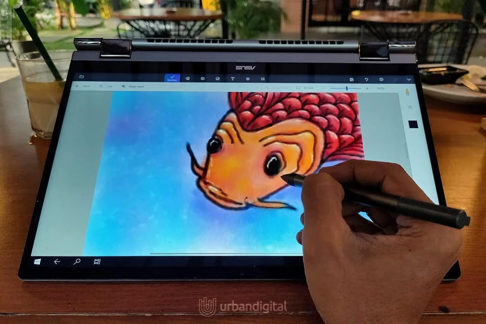 Di samping itu, mode tenda juga asik dipakai buat menggambar. Kalau mode tablet memberikan pengalaman seperti menggambar di buku gambar, mode tenda memberikan kesan menggambar di meja gambar. Dengan mode ini, posisi layar lebih kokoh jika dibanding memakai pena stylus di layar sentuh laptop konvensional.